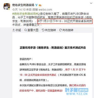 就在全军出击完成首测之后,和它一样有着绝地求生正统血脉的手游《绝地求生:刺激战场》也宣布将于1月31日下午18点正式开启安卓系统技术测试,并表示本次测试主要验证版本稳定及游戏体验,且本次测试暂不支持iOS系统。