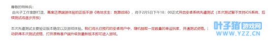 尊敬的特种兵: 由光子工作室群打造,高度还原端游体验的正版手游《绝地求生:刺激战场》,将于2月5日下午18:00正式开启安卓系统先遣测试(本次测试暂不支持iOS系统,后续测试将逐步开放) 本次先遣测试主要验证版本稳定以及游戏体验。我们将从已预约的安卓用户中,随机抽取一定数量的幸运玩家,开通测试资格。注:之前参与首测并登录过的玩家将自动获得本次测试资格,打开原有客户端升级到最新版本即可进入游戏。 不是所有的玩家都有先遣测试资格QAQ 也不是所有的手机都适配游戏QAQ QAQ QAQ 唯一值得欣慰的是: 所有用户在之后的游戏过程中都会获得【经典时装】、【神秘绝版礼包】等海量惊喜好礼。 正版吃鸡手游这个噱头不会是从《荒野行动》《终结者2》等一系列同类型游戏中争夺用户的制胜法宝,最终决定用户归属的还是游戏的优化及品质。 下面是几种预约方式和游戏适配的机型: 1、通过QQ号预约的用户,我们将在2月5日17点-23点期间,以名称为“QQ手游”的手Q公众号进行分批测试资格通知,注册游戏后请用预约的QQ号登录。 3、通过应用宝预约的用户,我们将在2月5日17点-23点期间,通过应用宝主页弹窗或应用宝系统通知框消息进行分批测试资格通知,注册游戏后请用预约的QQ号或者微信号登录。 4、 本次测试的资格发放与注册阶段均不会以任何形式向您索要钱财,切勿相信非官方信息,谨防上当受骗。 适配机型: