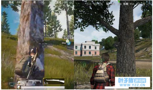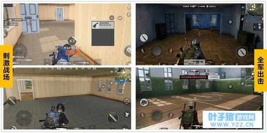 再给你们看下树的纹理对比,左边刺激战场的这棵树感觉像融化了的巧克力牛奶棒,右边全军出击的树,画质真心感人,给天美家的美术大大点个赞。 我们接下来对比下室内的场景设计及质感!