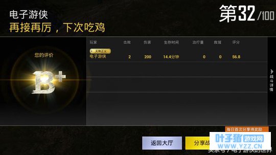 可是小编没有注意看提示,待在轰炸区里当的伏地魔,结果被莫名奇妙的炸死了,还得到一个称号叫做天降正义。小编处女秀的最终成绩是32名,击败了两个玩家。