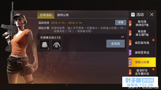 喊话绝地求生:刺激战场美工,你这是要毁三观啊!! 绝地求生:刺激战场 情人节活动已经火热开启:(登录后点击活动即可找到) 活动时间:2018年02月13日——2018年02月14日 活动详情:百变时装秀,情人节不孤单! 活动时间内 登录即送 红色魅影短旗袍(七天)、黑色魅影丝袜短裤(7天)! 活动时间内 任意战斗一次即送 小白裙(七天)、校服夹克(七天)!