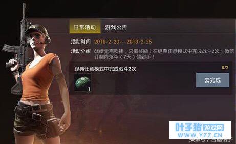 活动3:参与PK赠送降落伞(限一次) 时间: 2月23日~2月25日 在任意模式下参加2场战斗,奖励专属订制降落伞(7天)