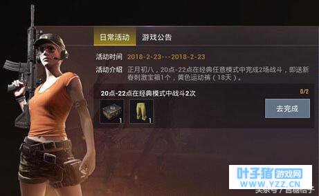 2、任意模式完成2场战斗可获得新春刺激宝箱1个,黄色运动裤(18天)