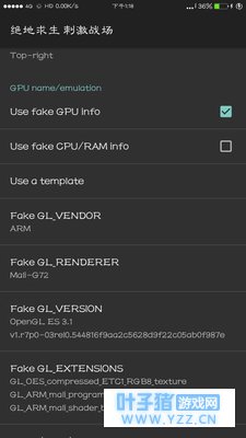 下拉至GPU name/emulation 第一项Use fake GPU info打勾 点击Use a template 选择Mali-T760 点击Fake GL_RENDERER把Mali-T760改成Mali-G72