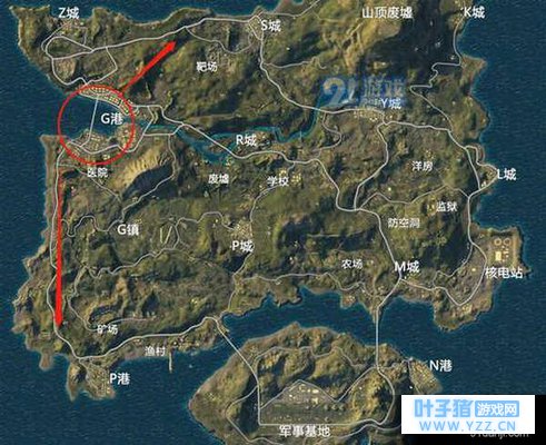G港资源分布 G港一般分为上城区和下城区,两个城区隔海相望,由一条跨海大桥和一条小桥连接。上城区主要都是街巷楼房,巷战高爆发的地带,建议调上部或者下部,不至于腹背受敌。下城区主要是由集装箱、厂房等组成,建筑物比较稀疏,资源比上城区要来得少一些。不过下城区也有上城区所不具备的一大优势,那就是载具多,刷车点多,有利于玩家及时做出行动,G港位于绝地岛边缘,载具是跑圈必备工具,否则可能就要跑断腿了。 G港战略分析 如上文所说,G港位于绝地岛左侧沿海,假如圈缩在军事基地等较为偏远的地方对于跑圈来说是非常不利的。如果圈缩在地图右下方的话,比较近的路线是绕过山脉路过G镇或者P城,但是G镇和P城也是敌人众多的地段,如果不想以身涉险,建议沿海岸线公路向下进发打野会更为安全。如果是毒圈缩在右上方的话,除了下城区需要过桥比较危险之外,上城区跑圈要更为顺利,不过要时刻提防拦路虎,因为有不少玩家虎视眈眈着从G港搜刮出来的快递员。