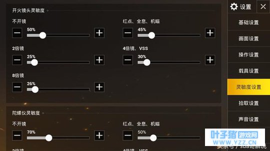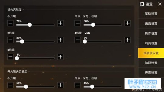 刺激战场开火镜头灵敏度 开火镜头灵敏度设置参数:不开镜50,红点、全息、机瞄45,2倍镜25,4倍镜、VSS30,8倍镜26。