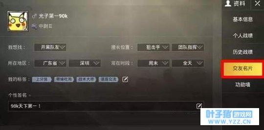 3、游戏会显示附近的人的游戏ID,段位和距你多远; 4、还可以在左上方的性别选项中选择,男、女、和不限哦! PS:鸡友可以根据自己的当前位置,寻找附近的玩家,还可以查看附近的玩家距离,点击头像可以看到玩家个人资料,并且可以在附近的人界面快捷地添加好友来共同组队进行游戏。 其他方法 1、设置交友名片,设置之后就可以发送给自己的朋友,这样就能进行交友喽!