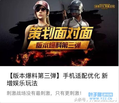 绝地求生:刺激战场新版本五大更新重点:开发高帧率,角色打击感提升;新天气、新角色、新时装;6大全新娱乐模式限时开放;师徒、附近的人等交友系统上线,助玩家开黑一臂之力;训练场开放,枪法实训。