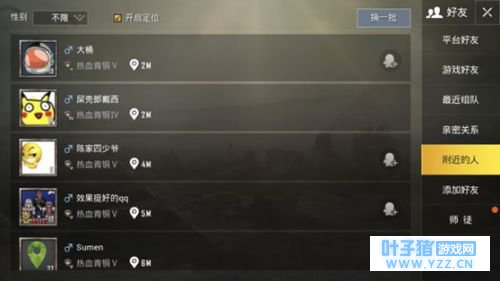 鸡友可以根据自己的当前位置,寻找附近的玩家,还可以查看附近的玩家距离,点击头像可以看到玩家个人资料,并且可以在附近的人界面快捷地添加好友来共同组队进行游戏。