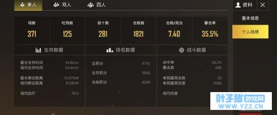不得不说,这确实是非常有天赋的一位玩家了,他玩的这么多场游戏中,都是单排的,总共玩了371把单人排位,其中吃鸡场次达到125把,吃几率已经达到了33.7%,碾压全服的程度。 在成为全服第一之后,估计主播也能够和平台谈一个很不错的价格吧。