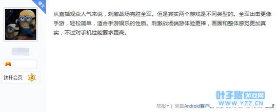 玩家对两款手游给出的评价: “我感觉这游戏真的太简单了,刺激战场打的非常激烈,而全军出击说真的简直是幼儿园”