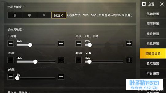 游戏中大家最常用的武器恐怕就是98K与M4了,今天我们也就用这两把枪作为例子像大家仔细讲解一下怎么设置才能够让你更容易做到98k瞬狙与M4压枪锁头了。 首先我们打开游戏设置选项,然后找到灵敏度设置,在镜头灵敏度中,我们先把红点与全息瞄准时的灵敏度调整到27%,四倍镜调整到25%,八倍镜我们就跳到5%,因为发达倍数最高抖动也是最厉害的,灵敏度要尽量调小。