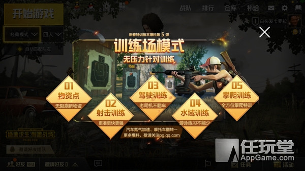 首先游戏在原有的内容基础上增加了一个训练场模式,该模式中的物资会无限刷新,并且平时比较难从游戏中得到的高级装备、稀有道具都能轻松获得,让玩家感受一下难得的欧气。玩家还可以在训练场中用各种装备打靶练练手,提高枪法以求在实战中可以发挥得更好;除了打枪之外,训练场也还可以让玩家练习车技、攀爬、游泳等技巧,让新手或者在实战中总因为各种原因没表现好的玩家能有全面提升的空间。