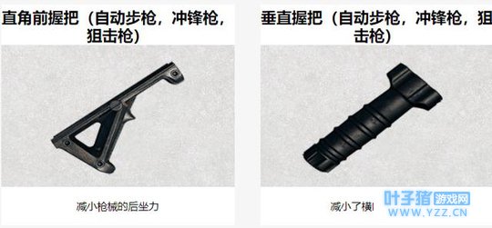 先从消焰器说起,消焰器具有消除枪口火光和减少后坐力的作用,不过它最大的作用还是消除火光,后坐力只是减少一些。这个大家就别纠结了,在没有找到补偿器和消声器的情况下可以使用。接下来是消声器,消声器具有消除枪声的作用,同时具有消焰,但是不具备降低后坐力的作用。此配件适合本身自身压枪技术比较好的玩家使用。最后是补偿器,补偿器具有降低左右和垂直后坐力的作用,但是不具备消声和消焰的作用,此配件适合本身压枪技术不怎么好的玩家使用,因为有些枪械装上这配件后,会是两种完全不同的体验。 握把 自动步枪的握把有两个分别为直角前握把和垂直握把两种,以下是它们的外观和介绍。