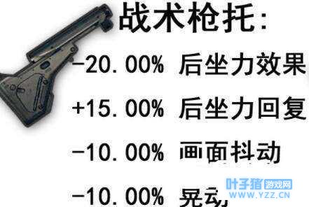 在压枪效果上看,还是垂直握把压得效果更好,水平后坐力一般很难减少或消除。 战术枪托、托腮板 在枪屁股的选择上,这两个枪托是在难舍难分,战术枪托可以减少20%的后坐力效果,还可以增加15%的后坐力恢复,同时减少画面的晃动和抖动,实为一个必要装备。