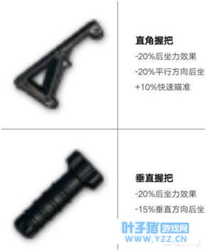 垂直握把、直角前握把 在这两款握把的选择上一直难以得出结论,玩家对于这两种握把持有各自的看法,还是针对个人喜好进行挑选。垂直握把,可以减少15%的垂直反冲作用力,步枪在远距离设计上,稳中求准才是王道;直角握把,它的稳定效果更加全面,不仅减少20%的水平反冲,还加速的开镜速度,在射击游戏上,争夺的就是速度,先手占据优势。