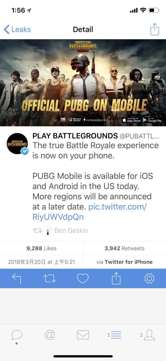 前段时间手游版《绝地求生》已在加拿大开启了Beta测试,而今日,PUBG官方在 Twitter 上推的是光子工作室制作的绝地求生:刺激战场。目前游戏已经上架了Apple Store和Google Play。