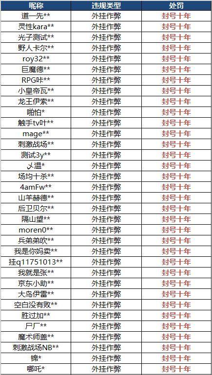 根据官方公示的处罚规则,我们将对这几十位作弊玩家账号进行封号处理,对于部分违规恶劣的用户我们将持续进行公示。 同时,我们还将启动线下对外挂制作及销售渠道的打击;将联合警方开展刑事打击,严惩不怠! 此外,针对利用违规昵称在游戏榜单进行非法广告宣传的违规用户,官方已经开启处罚,针对这部分用户将清除榜单并封停10年,此榜单将定期