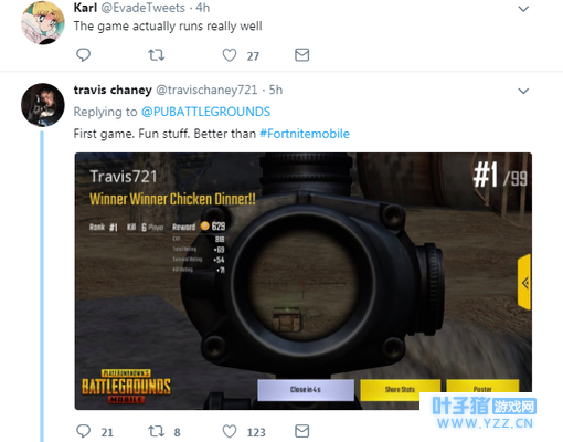 这条消息经过官方发布后,美国的玩家反响热烈,玩家Karl称游戏真的很好,玩家travis chaney甚至晒出了一张《绝地求生:刺激战场》吃鸡截图,称:第一把。有意思。比《堡垒之夜:大逃杀》手游好玩。