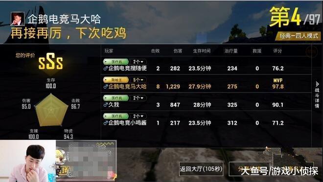 不过这波马大哈依然是mvp,最后评分97.8,击败了8个敌人,比起之前第一个死的操作,现在的马大哈进步还是非常大的。那么,队友马大哈的这种进步速度,小伙伴们怎么看呢? |