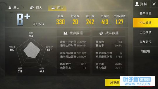 目前玩了三百多场,前十有二百多场,吃鸡很少,才二十次,很多吃鸡的成绩还是队友给力拿下来的,小编只是沾了队友的光,而且我一直是临时组队玩吃鸡的。好友太少了,很难在相同的时间一起组队,所以我只能野组了。