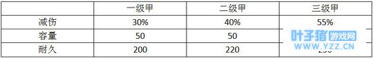 一级甲 一级防弹衣的属性如下: 减伤30%,容量+50,耐久200 2、二级甲