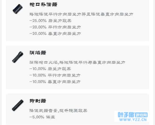 补偿器硬性能加成 先给大家介绍一下三款枪头配件! 消焰器!顾名思义:其主要功能是消除枪头射击时焰火,但很多玩家不知道,消焰器还有降低后坐力的功能的! 补偿器!补偿器同样也有降低后坐力的功能!并且还能提高一些武器伤害 [略微降低平行后坐力大大降低垂直方向后坐力!为了便于区分和消焰器的区别就说为提高伤害吧}! 消音器!降低射击声音,最被玩家喜欢的原因还是不显示枪声画面提示!只能敌人做到真正的听声辨位才能知道你的位置,这在手游中根本做不到!