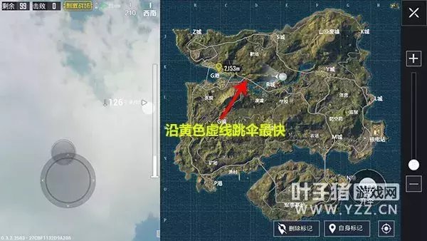 比如跳伞时,人物与目的地之间有一条黄色的虚线,轨迹与虚线重合即跳伞的最短距离。