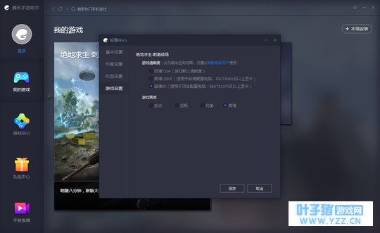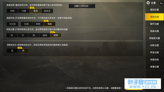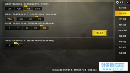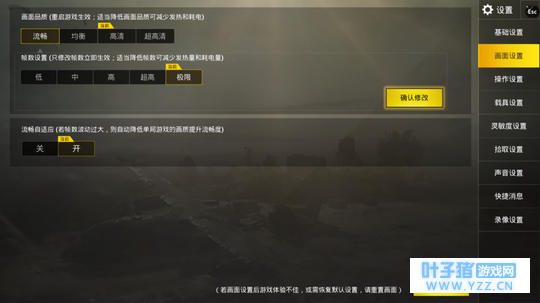 然后是游戏设置,这里建议大家的游戏画质选择“均衡”。 这些都设置完毕记得点击“保存”按钮,然后会提示需要重启模拟器哟。 接下来是游戏内的设置了。 基础设置,这里每个人的操作习惯不同,苹果是把刺激战场的按键设置成和PUBG一样。