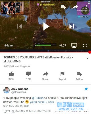 elrubiusOMG的直播 目前,《堡垒之夜》同时在线人数超过了340万人,完胜《绝地求生》,玩家总数也已经突破4000万。在3月27日,国外《堡垒之夜》的直播又诞生了新记录,油管西班牙语主播elrubiusOMG的一次直播吸引了110万人观看,直播录播视频播放量达到1600万次,高过许多热门电影、游戏预告。可见《堡垒之夜》现在的热度相当高。 就连《绝地求生》的创意总监Brendan Greene都表示很高兴看到《堡垒之夜》的成功。
