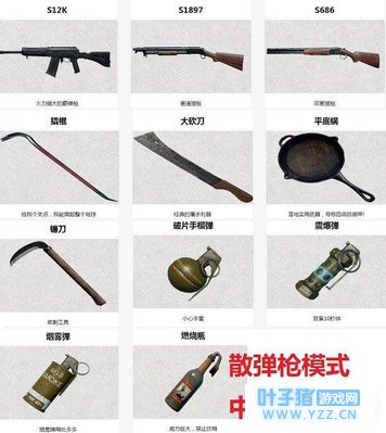 首先我们要明确一点,在【霰弹枪】玩法中,我们所能捡到的只有三种武器,那就是霰弹枪、近距离武器和投掷武器!而像什么手枪之类的,在【霰弹枪】玩法中是根本看不到,想都不用想! 但是很多人对霰弹枪都不是很了解,因为绝大多数人在经典模式中战斗的时候,除非在大型资源区落脚后,看四周没有其它武器的情况下,才会捡一把霰弹枪用来防身。所以导致很多小伙伴对霰弹枪不了解!