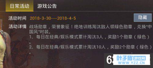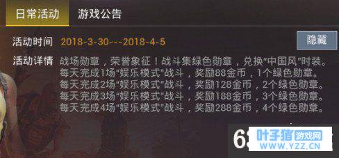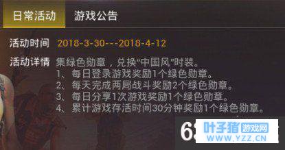 1、活动时间:2018年3月30日-2018年4月12日 活动详情:集绿色勋章,兑换“中国风”时装。 (1)每日登录游戏奖励1个绿色勋章。 (2)每天完成两局战斗奖励2个绿色勋章。 (3)每日分享1次游戏奖励1个绿色勋章。 (4)累计游戏存活时间30分钟奖励1个绿色勋章。