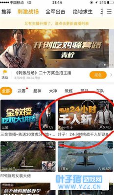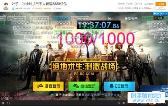虎牙叶子将会在直播的时候挑战在24小时之内杀1000个人,玩这游戏的玩家都清楚,这个游戏一把一共有100个玩家,但是想在每局里面击杀10或以上是非常难的.