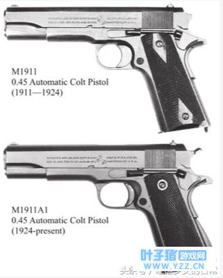 纳甘M1895 游戏中唯一一款转轮手枪。19世纪90年代比利时纳甘兄弟最初设计,支持安装消音器,在当时转轮手枪中非常少见,并且采用了特殊的气体密封式设计。在手枪的击锤被拉低后其弹巢会向前移动,同时亦封闭了弹巢与枪管之间的空隙,增加了子弹的初速。但是缺点也非常明显需要经常更换弹匣或装填子弹。 2、P1911 原型M1911