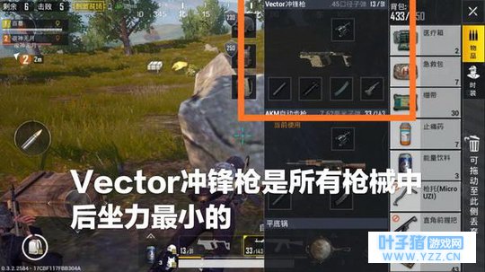 ♦突出特点:近距离战斗能力极强,但后坐力也极高。 ♦性能数据:非头部裸伤38,头部裸伤95,子弹口径0.45mm,射速0.086s,容量30(40)。 ♦配件:枪口:冲锋枪消音器/冲锋枪补偿器/冲锋枪消焰器,握把:垂直握把/直角前握把,弹夹:冲锋枪快速弹夹/冲锋枪扩容弹夹/冲锋枪快速扩容弹夹。 ♦枪支对比:冲锋枪中拥有最高伤害,但后坐力偏大的缺点让该枪的中距离战斗实用起来并不客观,不可安装倍镜,在很多小伙伴的眼中,该枪可谓是满满的缺点了,但在人们的偶尔使用下,却意外的发现该枪在打击载具时,劲道十足,因为载具车身较大正好弥补了汤姆逊后坐力偏大的缺点,加之汤姆逊伤害较高的特点,所以极受欢迎于攻击载具的场合,对载具攻击尤为有效,这是该枪最大的优点之处。 ☑【最稳冲锋:Vector冲锋枪】 实用性能:★★☆☆☆ 获取难度:★★★★☆ 配件要求:★★★★★ 操作要求:★★★★☆