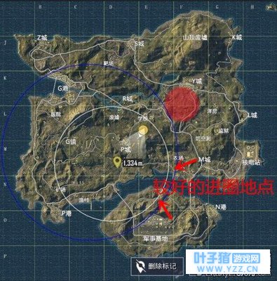冲锋枪在近距离作战的时候也是不错的选择,比如UMP9。 最后别忘了捡几个碎片手雷。 4、如何进圈 尽量选择大圈(蓝色)与小圈(白色)相距最近的点进圈,这样做可以降低敌人从后方冒出的几率,避免前后夹击和被首先发现。