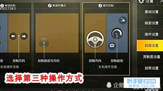 刺激战场·漂移步骤 首先我们载具模式设置成第三种模式:摇杆模式,当车速达到90-150迈时,我们点击急刹车按钮,同时左边控制方向盘的摇杆往要漂移的方向拉就OK了。