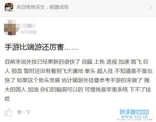 从古到今,不知道有若干游戏死在外挂上了,看来这款吃鸡手游也不会例外了。像腾讯这款吃鸡手游这样,玩家不开挂就吃不了鸡的,凉凉便是迟早的事。 |