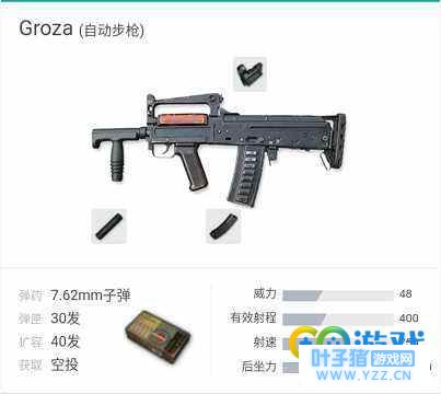 主战型枪械,有效射程远不容易打飞。在版本调整后加入了较高的水平后座力,着弹点非常随机,即便是职业选手也很难驾驭的一把步枪。枪口初速度为所有步枪中最慢,远程打移动靶能力也让人蛋疼。主要使用环境还是近战副枪,20米内全自动扫射触头即倒。优点是容易获取弹药,以及两枪爆三级头的威力。应该是目前版本中最弱的一把步枪。推荐配镜全息。 TOP5、Groza