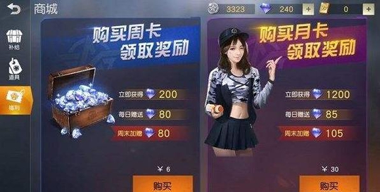 第二种,月卡必须要有月卡这个套路在手游上是屡见不鲜的,而且是非常奏效的,一看,充值30元可以一次性领取这么多钻石,还有每天领取这么多??我擦,老马血亏,玩家血赚啊!!充充充!!(荒野行动配图示意)