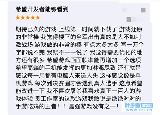 土豆条小编也在应用商店中看到了不少玩家对于刺激战场这款游戏给予了肯定,看来刺激战场在吃鸡手游中的竞争占有了大部分市场呀!不过想来也是,认真做游戏的态度和还原端游的质量都很好地展示了玩家选择这款游戏的原因。