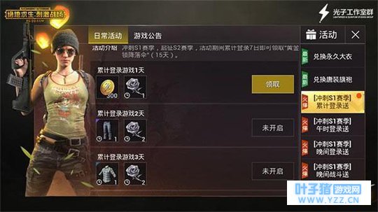 登录即送 不同时段登录奖励不同 在即将结束的S1赛季,《绝地求生:刺激战场》手游为广大玩家带来更丰富的奖励:2018年4月17日-4月26日,活动期间累计登录7日即可领取“黄金降落伞”(15天);2018年4月13日-5月10日,每日12点~14点登录游戏,即可领取188金币,中级时装礼盒(1天);2018年4月13日-5月10日,每日20点~23点登录游戏,即可领取288金币;2018年4月13日-5月10日,每日20点~23点经典或娱乐模式中完成1场战斗,即可领取高级时装礼盒(1天)。