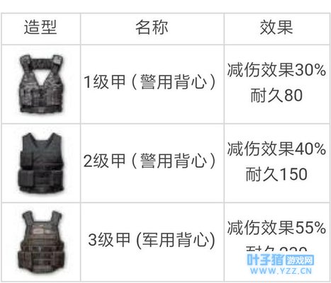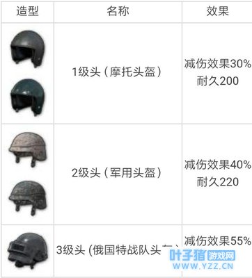 我们统一用AKM步枪作为示范: 1.摩托头盔最为常见减伤比例是30% (AKM步枪一枪爆头死) 2.军用头盔分减伤比例是40% (AKM步枪一枪爆头剩余20%血量左右) 3.俄罗斯特种部队头盔,减伤比例是55% (在满血的情况下 除了AWM 没有任何武器能够一枪爆头击杀你!) 头盔常识 作为老手的我们是不首先看耐久度的(也就是血量)而是看减伤效果。三级头盔那怕只剩下1滴耐久度,也能替你挡下55%的伤害,救你一命,但是头盔会炸掉。如果有一个一半耐久的3级头盔,应该将身上的一级或二级头盔换下。 防弹背心性能一览图: