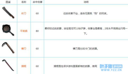 近战武器: 近战武器除了平底锅,基本上玩家也不会捡别的,只有两人同时落在一起,而你拥有近战武器的时候可以直接爆人家的头,特别是平底锅,能防弹不说,还能一下打爆敌人的二级头。