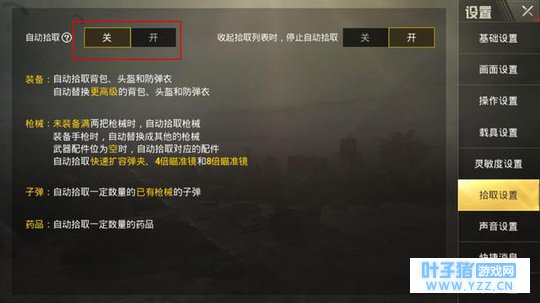 4、将自动拾取关闭,这个功能只适合新手,它会拾取一些没有必要的装备,还得手动丢弃,大大的浪费了时间。如下图:
