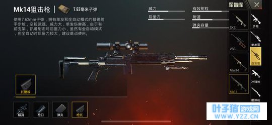 Mk14狙击枪 空投连狙 使用7.62子弹 单发伤害高拥有全自动模式 有前支架趴下能大大减少后坐力 配件选用八倍镜 枪口补偿器 快速扩容弹夹 托腮板 满配后拥有20发子弹 后坐力降到最低 因为此枪需要趴下才能进一步降低后坐力。全自动也是鸡肋,实战中小编认为性价比完全不如sks。 你认为连狙中你用的最顺手呢?快来同小编一起分享你的实战经验吧! |