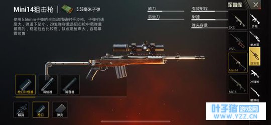 Mini14狙击枪 使用5.56子弹 此枪初速高 射程远 弹道下坠小 后座小 不失为一把狙击好枪 配件选用八倍镜 枪口补偿器 快速扩容弹夹 装配后拥有30发子弹是连狙中子弹最多的。 枪口不装消音是为了此枪稳定,因为连狙的特性,没有一枪爆头的快感,拥有极好的容错率。使用主流步枪子弹也让它在战场发挥的时候不尽人意。
