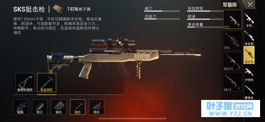 Sks狙击枪 使用7.62子弹 是所有狙击枪中配件最多的。单发狙击伤害高,但后座力大。配件选用八倍镜 枪口补偿器 快速扩容弹夹 垂直握把 托腮板 最大化减少后坐力 满配后sks拥有20发子弹 模式选用单发模式 还没等敌人反应过来,两三枪点死对手不是梦。