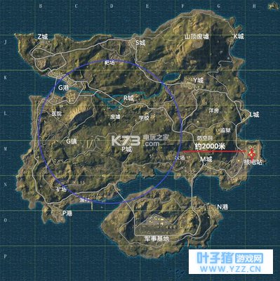 可以看到,我们是一个再标准不过的天谴圈了,通过我们的计算我们可以在280秒,也就是约4分钟跑出毒圈。根据上面的计算,这个距离下,我们必须要在开始缩圈之前跑到出1000米,然后在开始缩圈的时候圈才能保证自己进入安全区,学会计算时间差之后可以大大的降低自己的遇敌概率。
