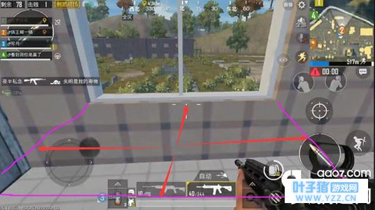 室内卡位 在第三人称模式下,一般处于室内的玩家都会选择一处墙壁和窗口位置来应对内外的敌人,因为我们可以借助第三人称模式的特点来获取掩体外部视野,同时安全的隐蔽自身。而在第一人称模式下继续沿用此方式非但不能获取良好的视野,还容易被阻挡视野。所以现阶段如果处于室内,那我们在建筑窗口观察外部视野时则需要注意与窗口保持一定的距离。如下。